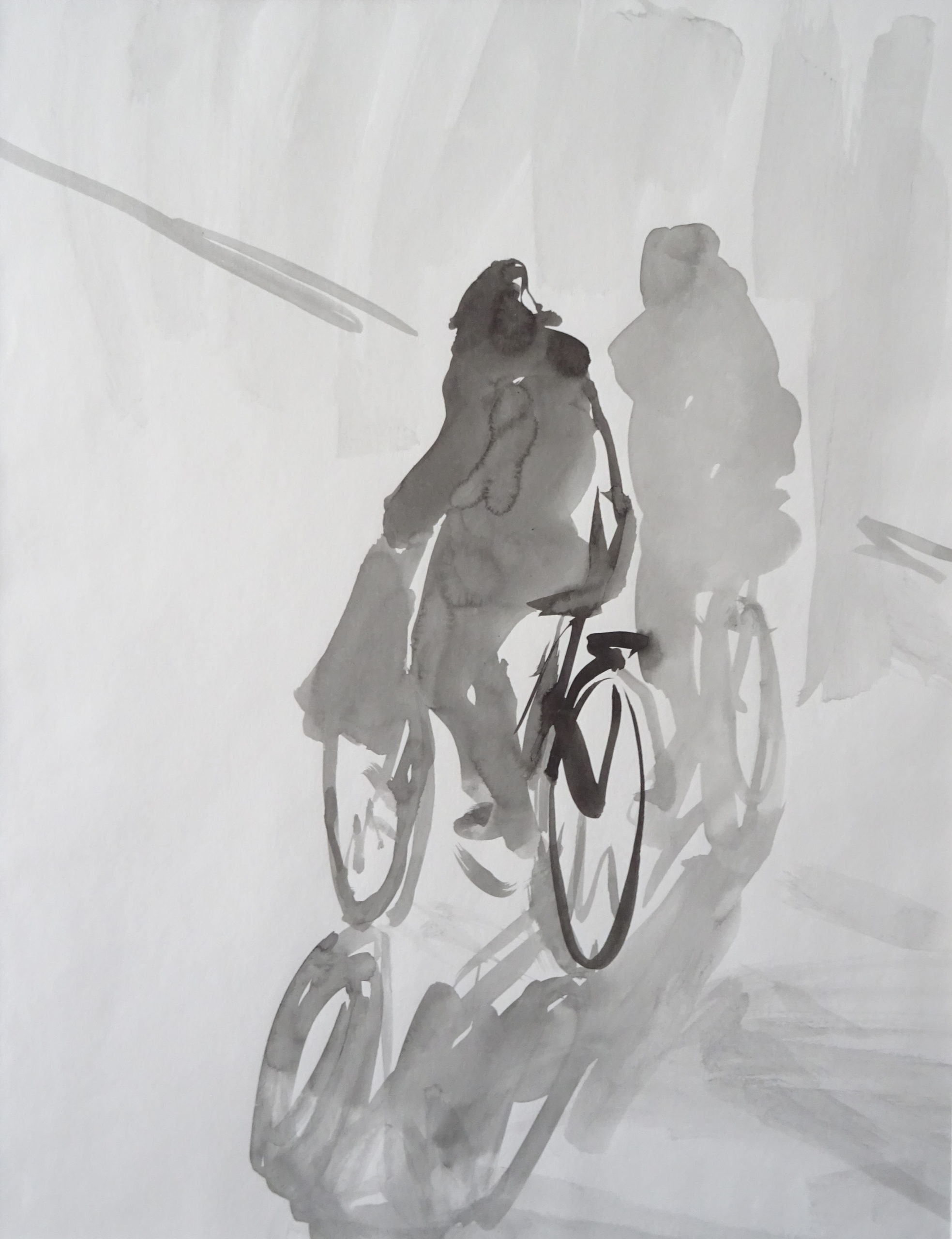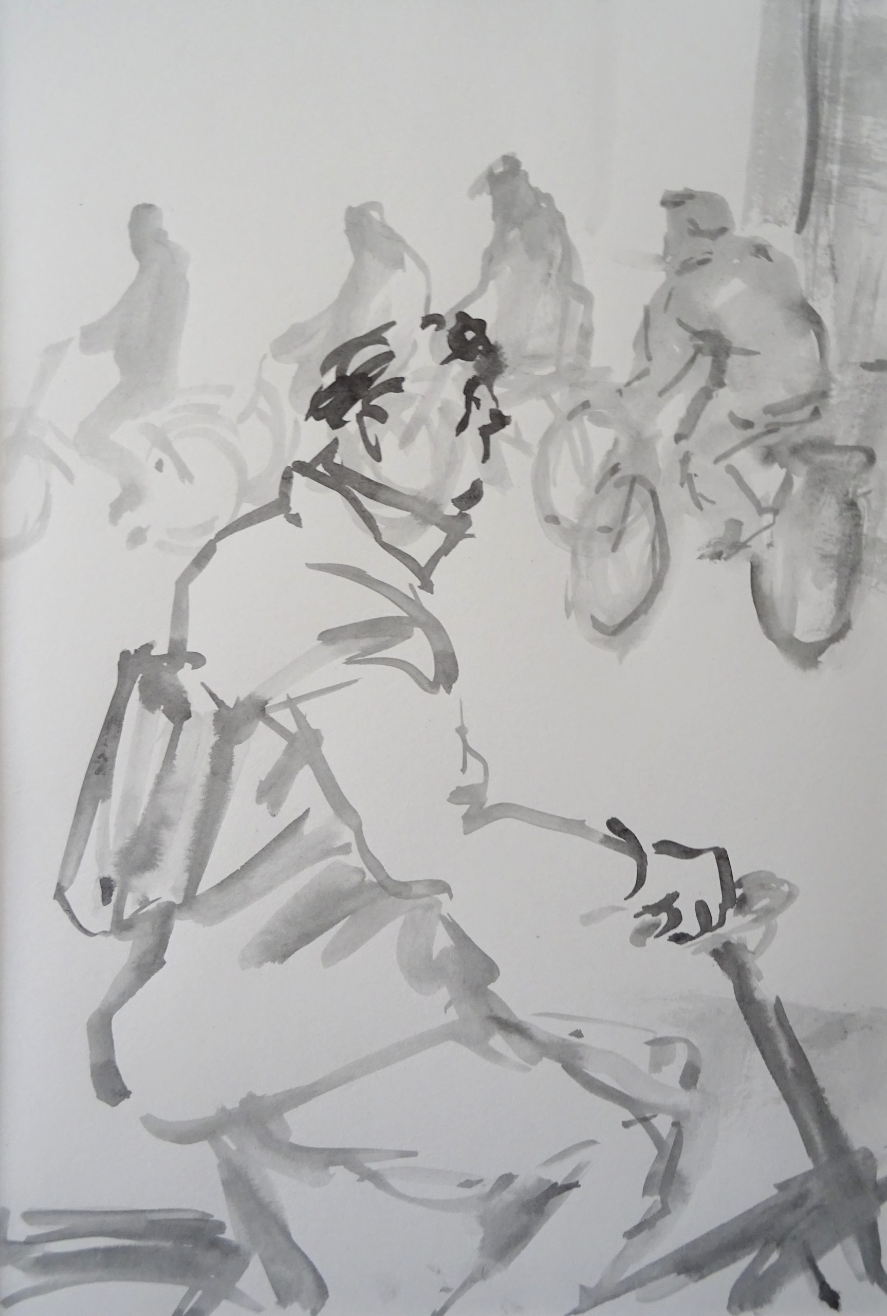 wegfietsen, penseeltekening, 23,5x16cm, 2024