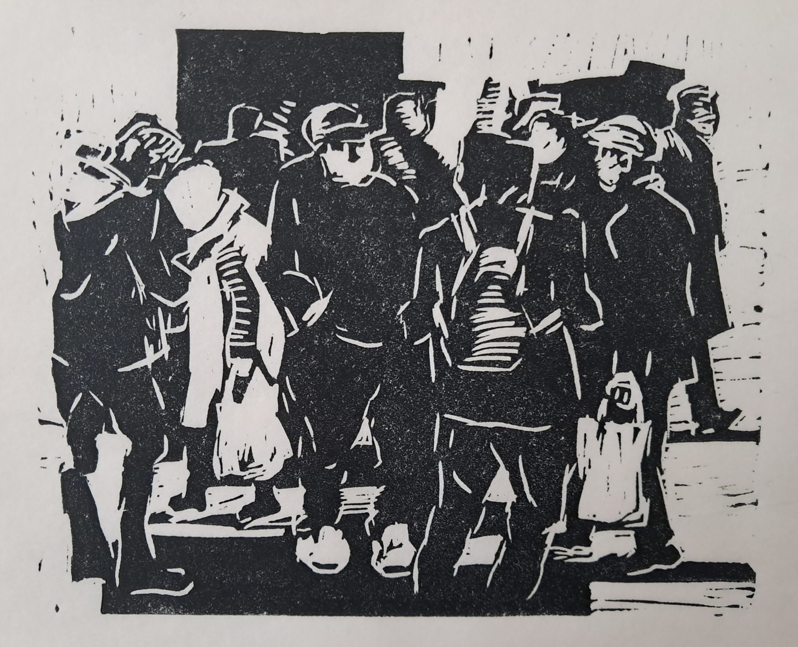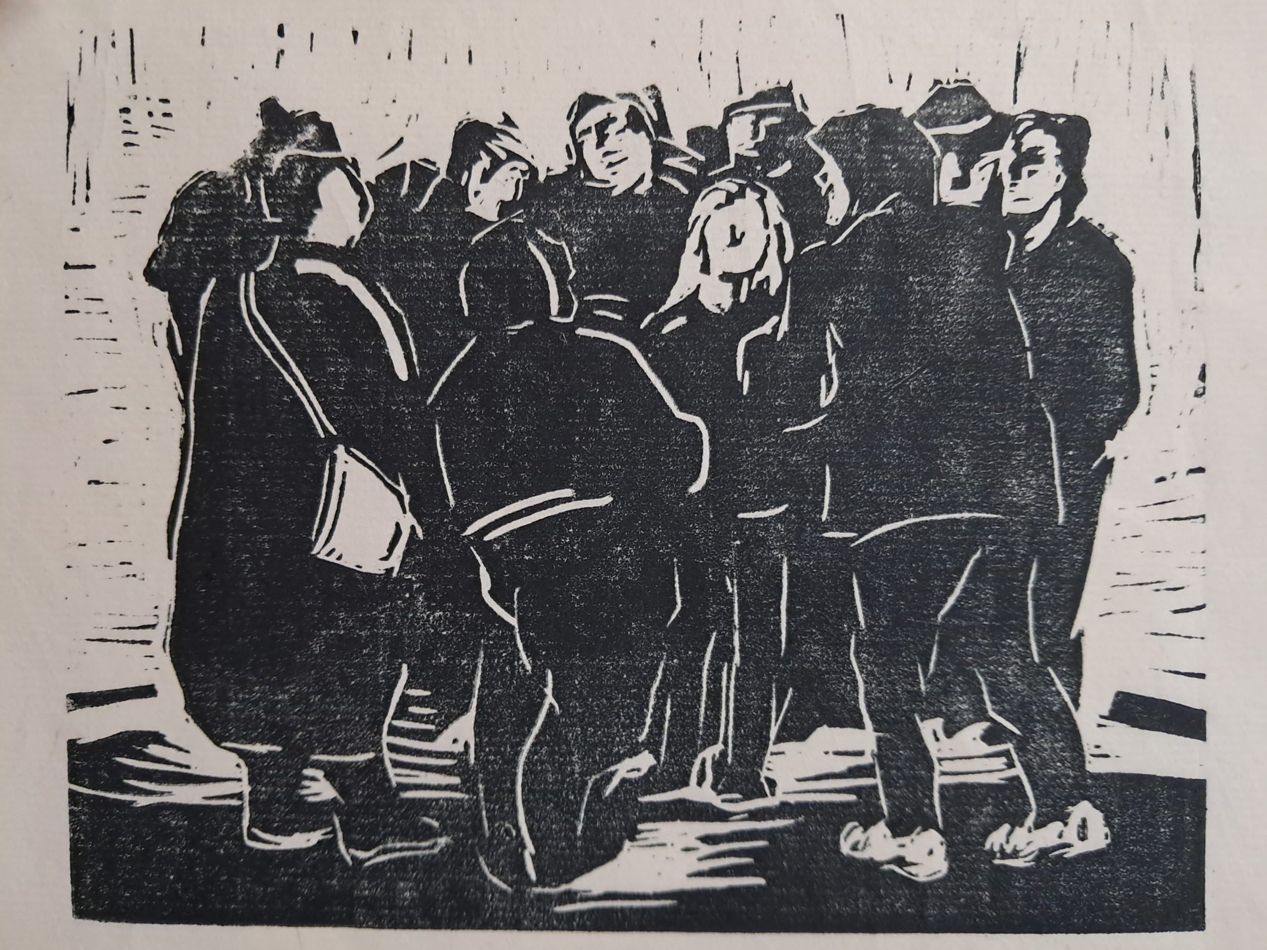 wat is er aan de hand, linosnede, 15x12cm, 2024