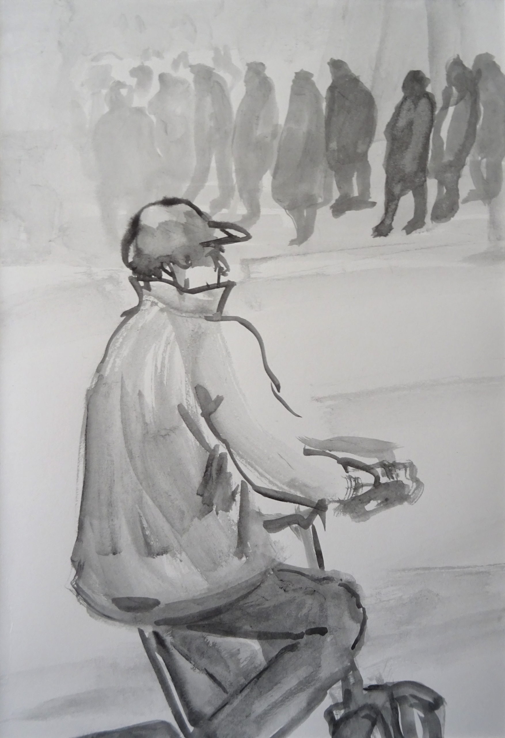 op vouwfiets, penseeltekening, 30,5x21cm, 2025